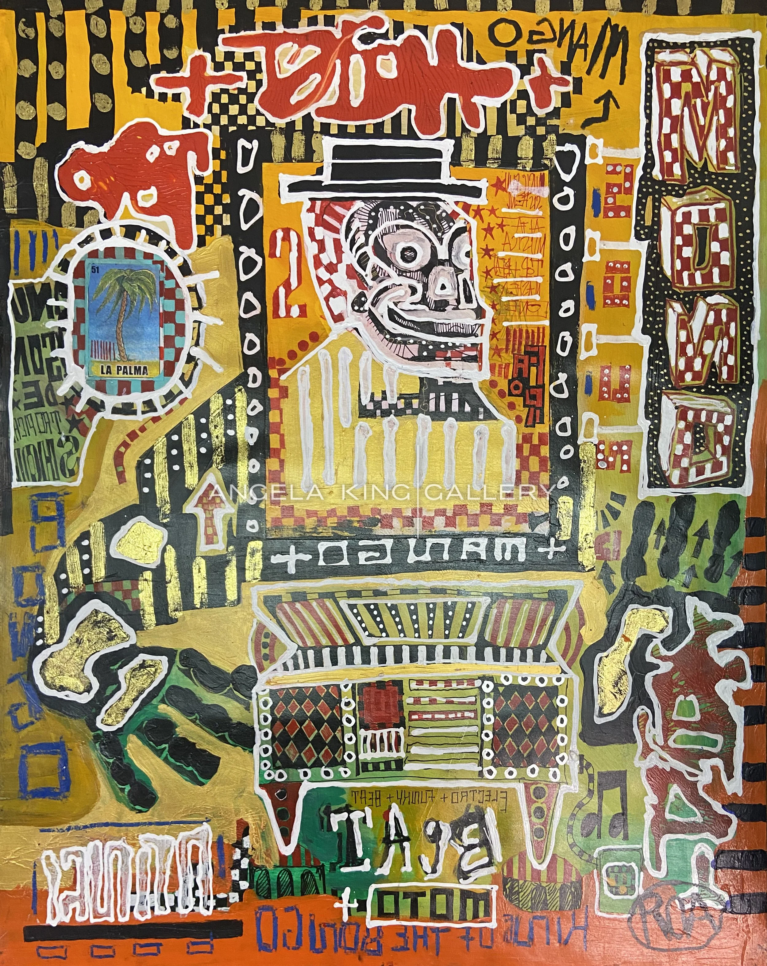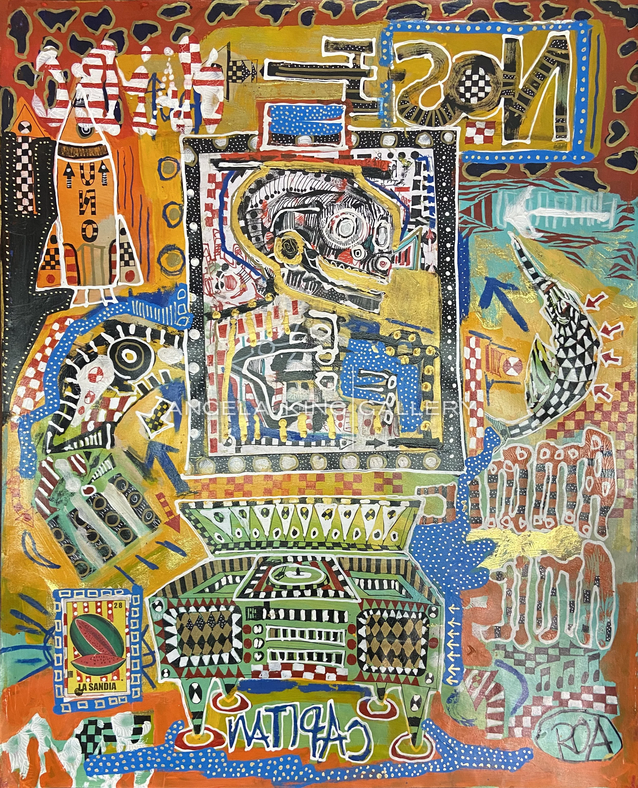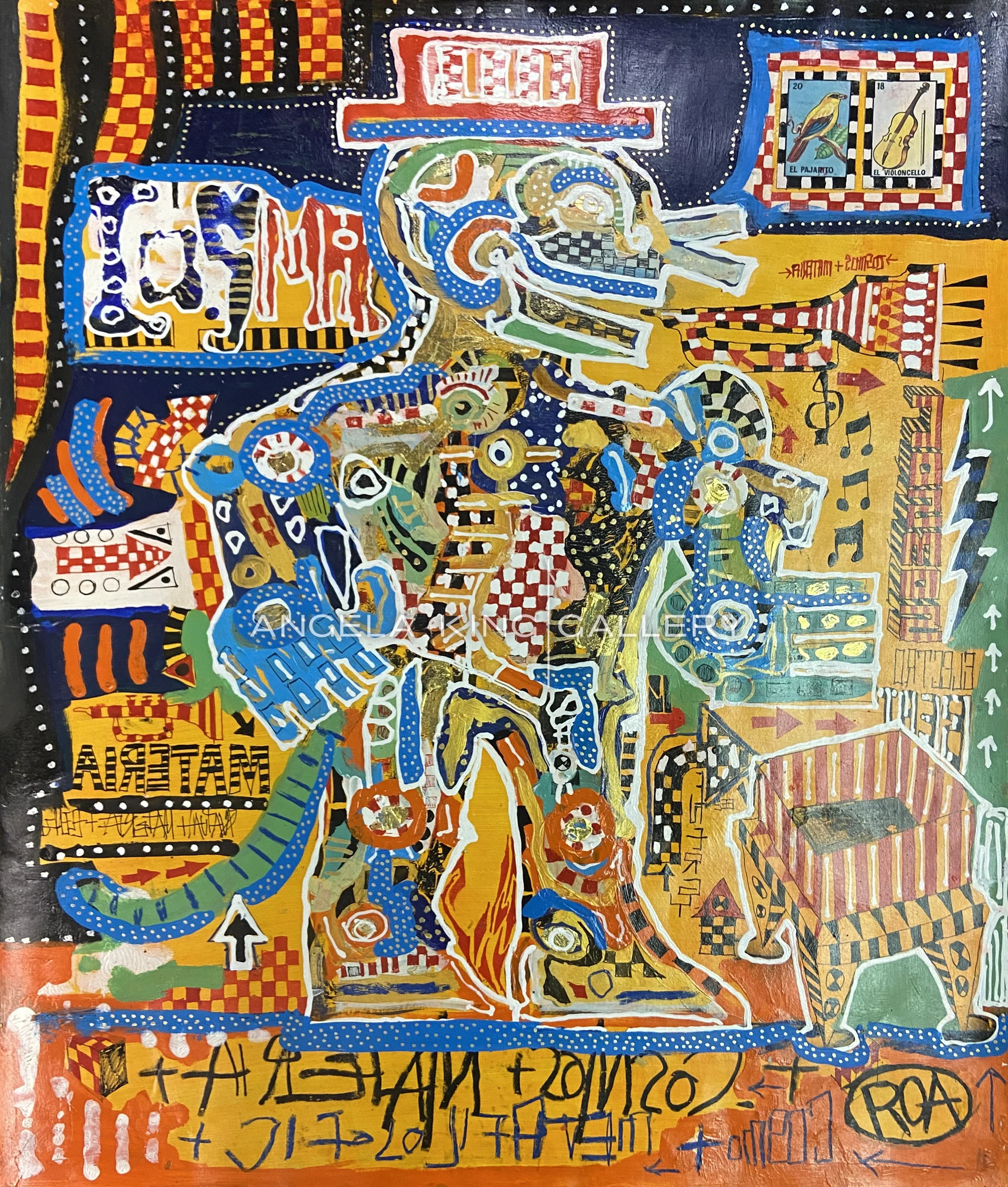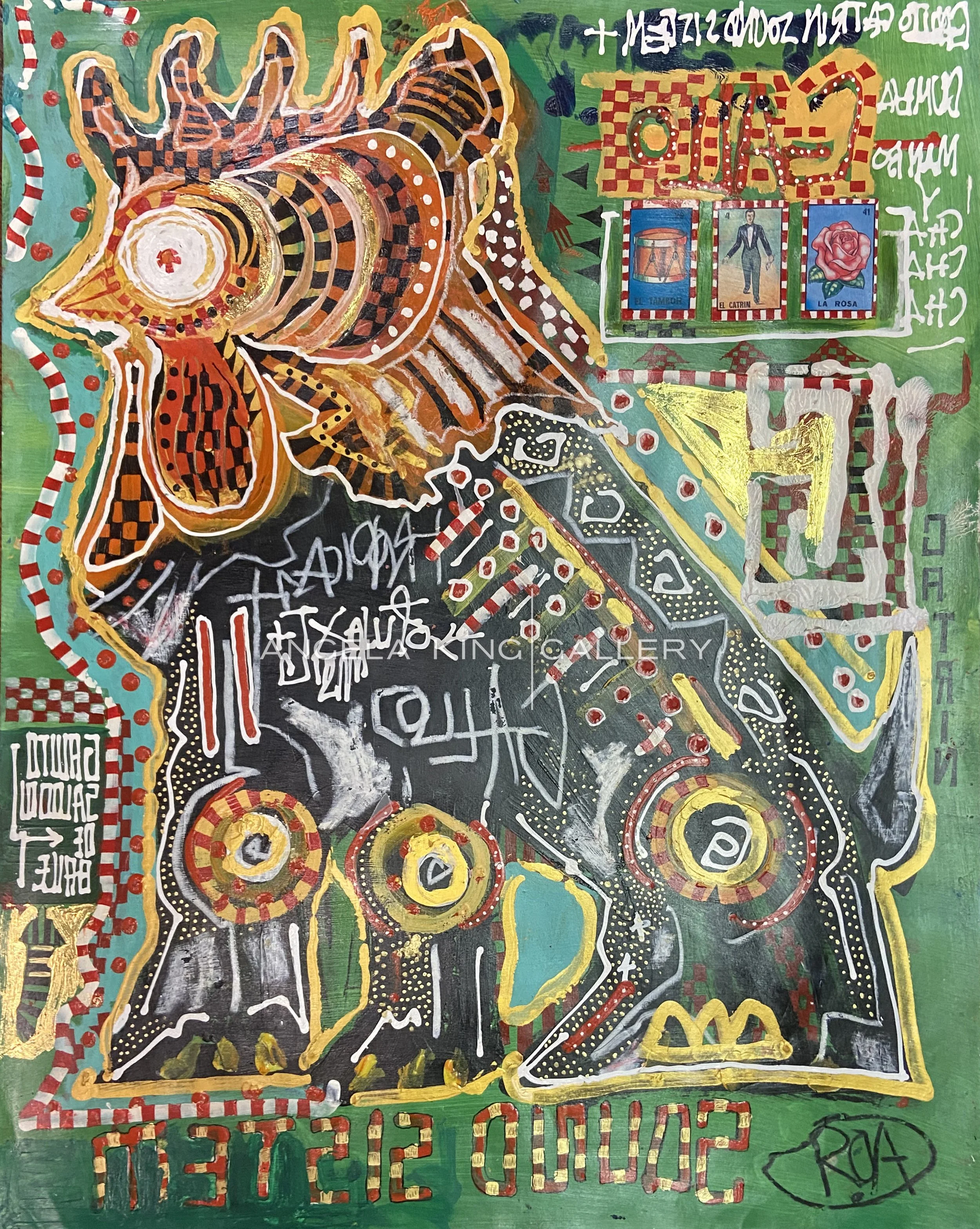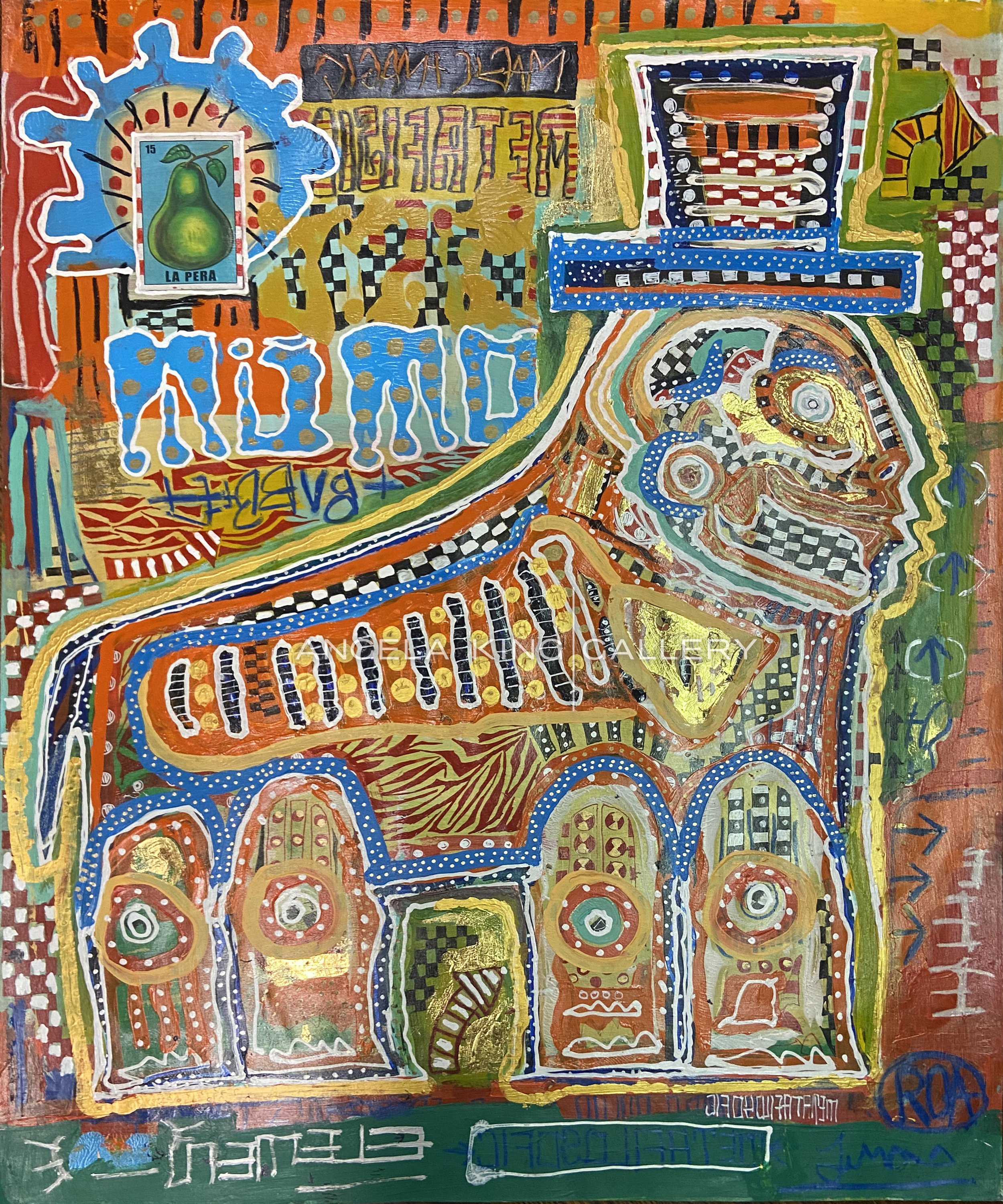 Jacobo Roa is a Mexican artist that combines all of the visceral elements of his life into mixed media pieces that sparkle with bursts of symbolism and color. Roa creates abstract work by way of realism; the emotional thing by means of intellectualism; spontaneity by way of strategy. Roa takes the artifacts from everyday culture and transforms them into extraordinary compositions. The imagery in Roa’s work is a collection of messages, poems, letters; scientific formulas, magic recipes, classifications of ants, medicinal plants and herbs; addresses, numbers, cities, arrows, signs, compasses, names and places that inhabit his world; words in Spanish, Nahuatl, Maya, Latin, or English that have no absolute meaning but rather move and connect within his paintings, to be considered as part of a window to their worlds.