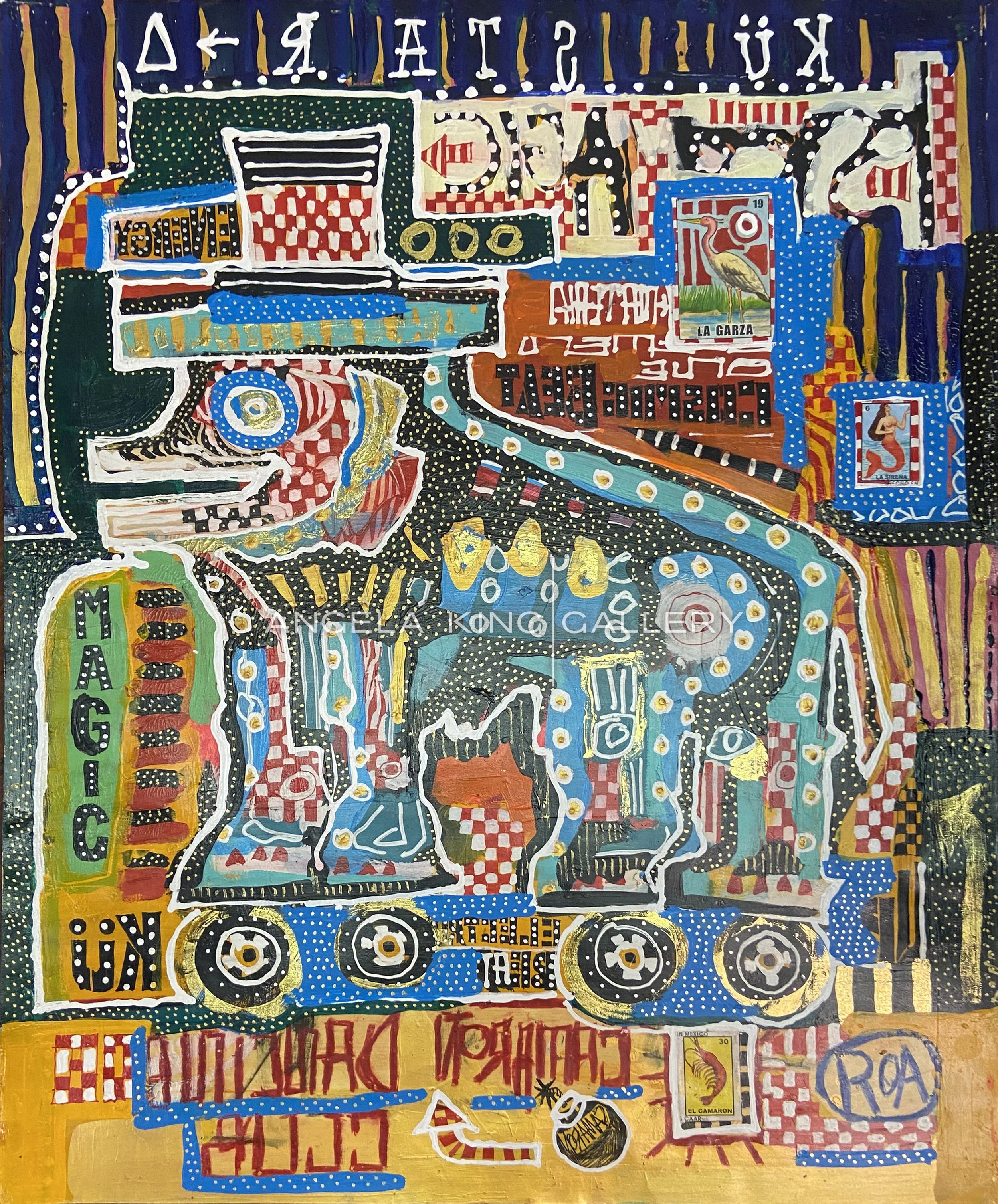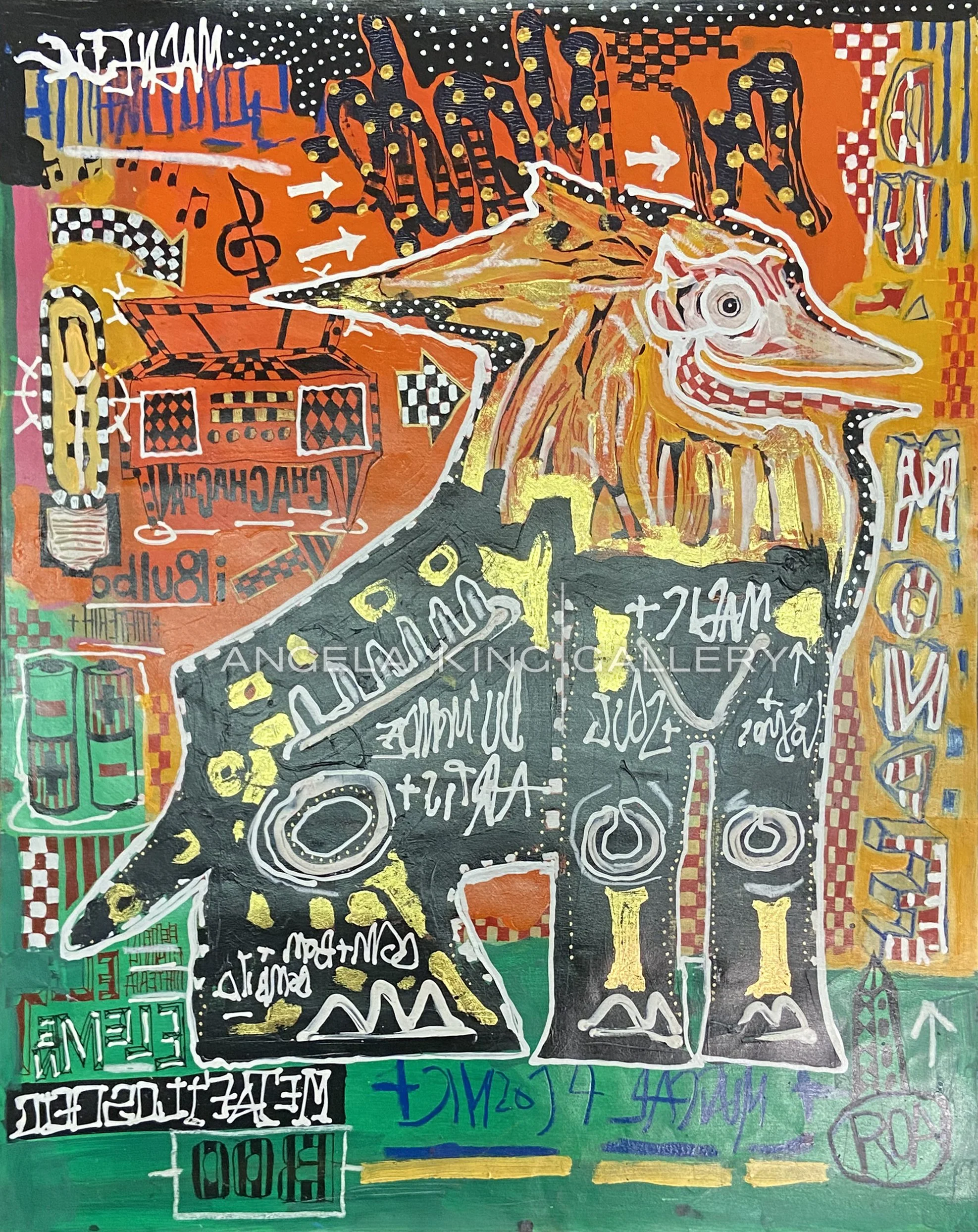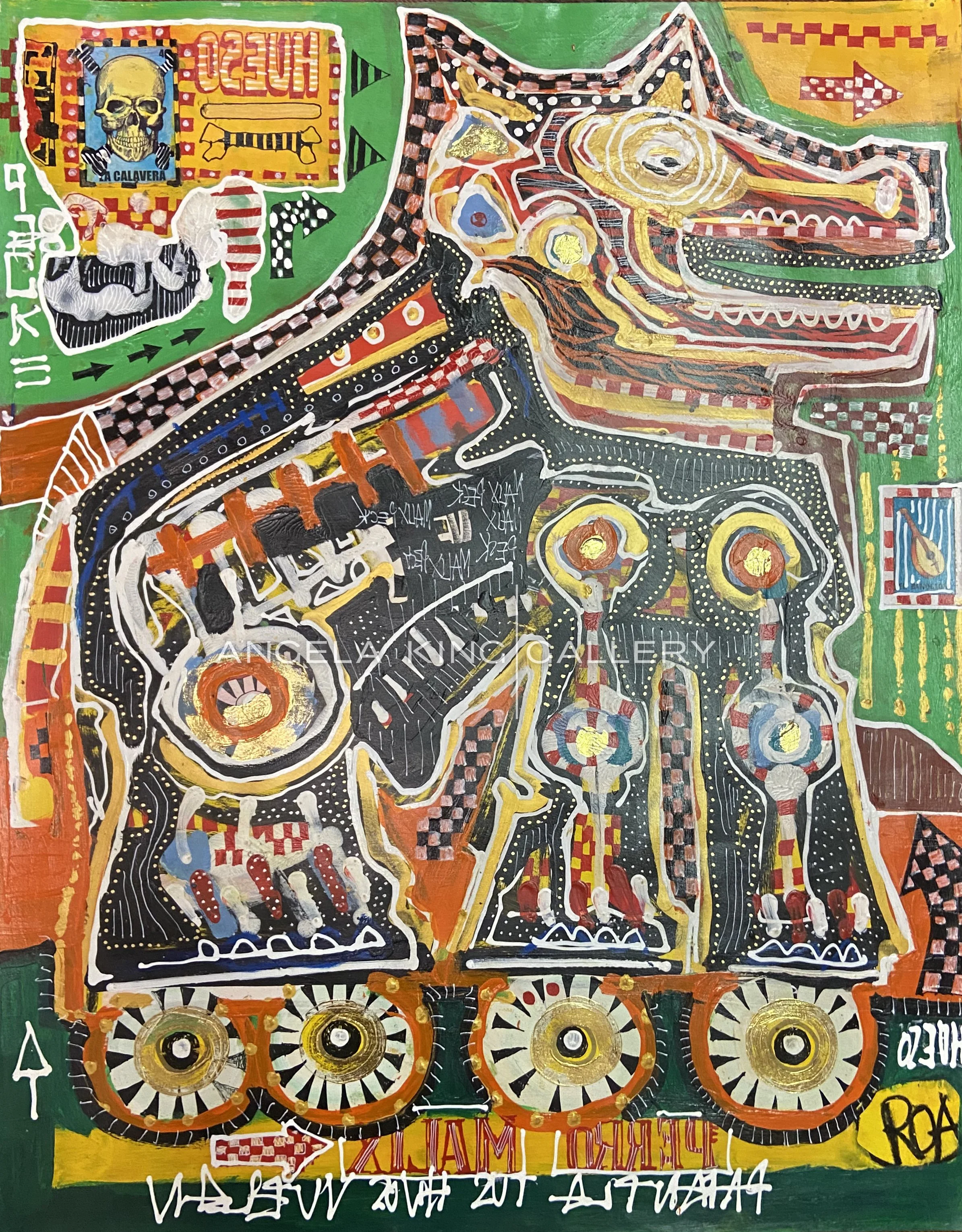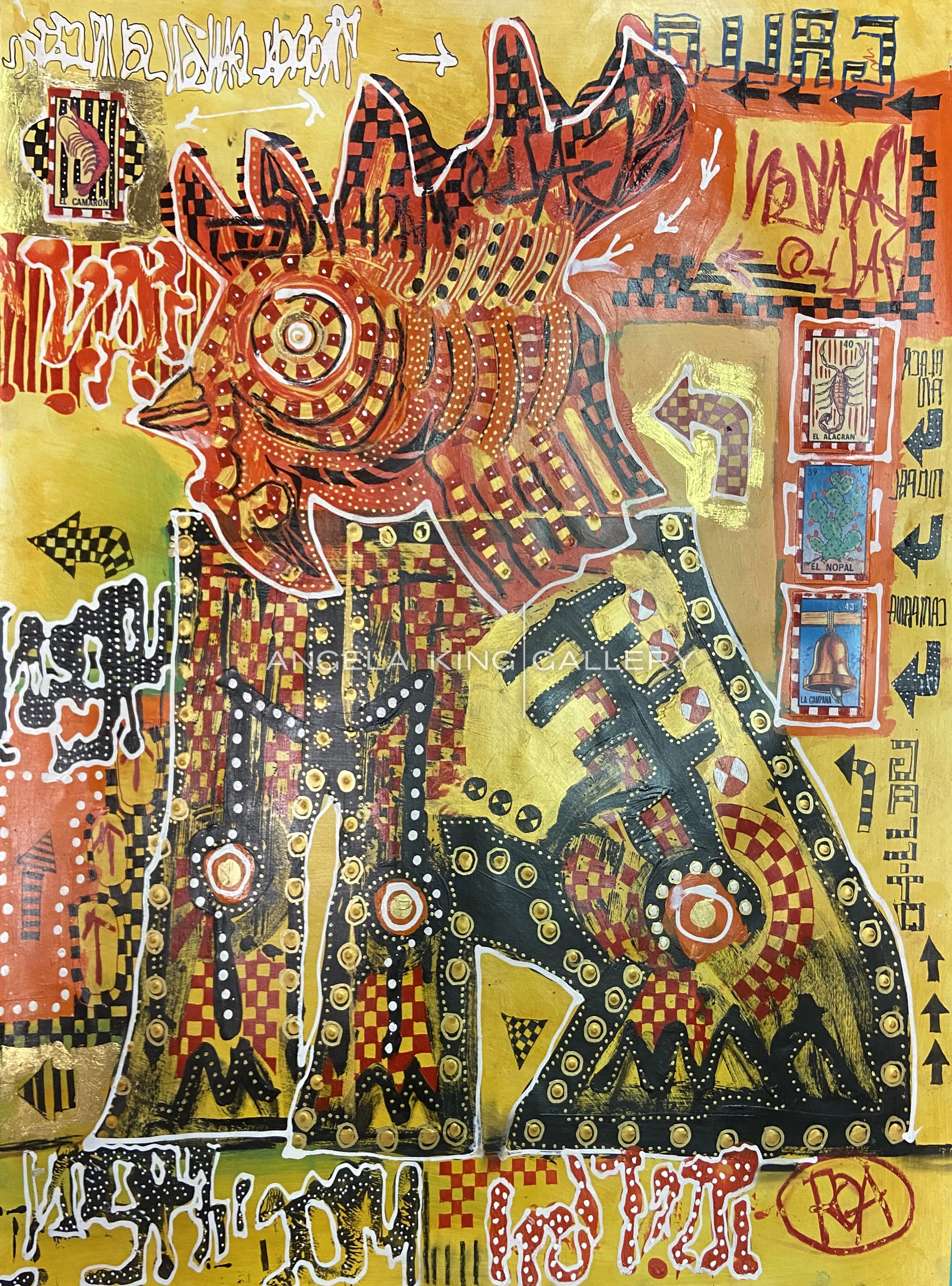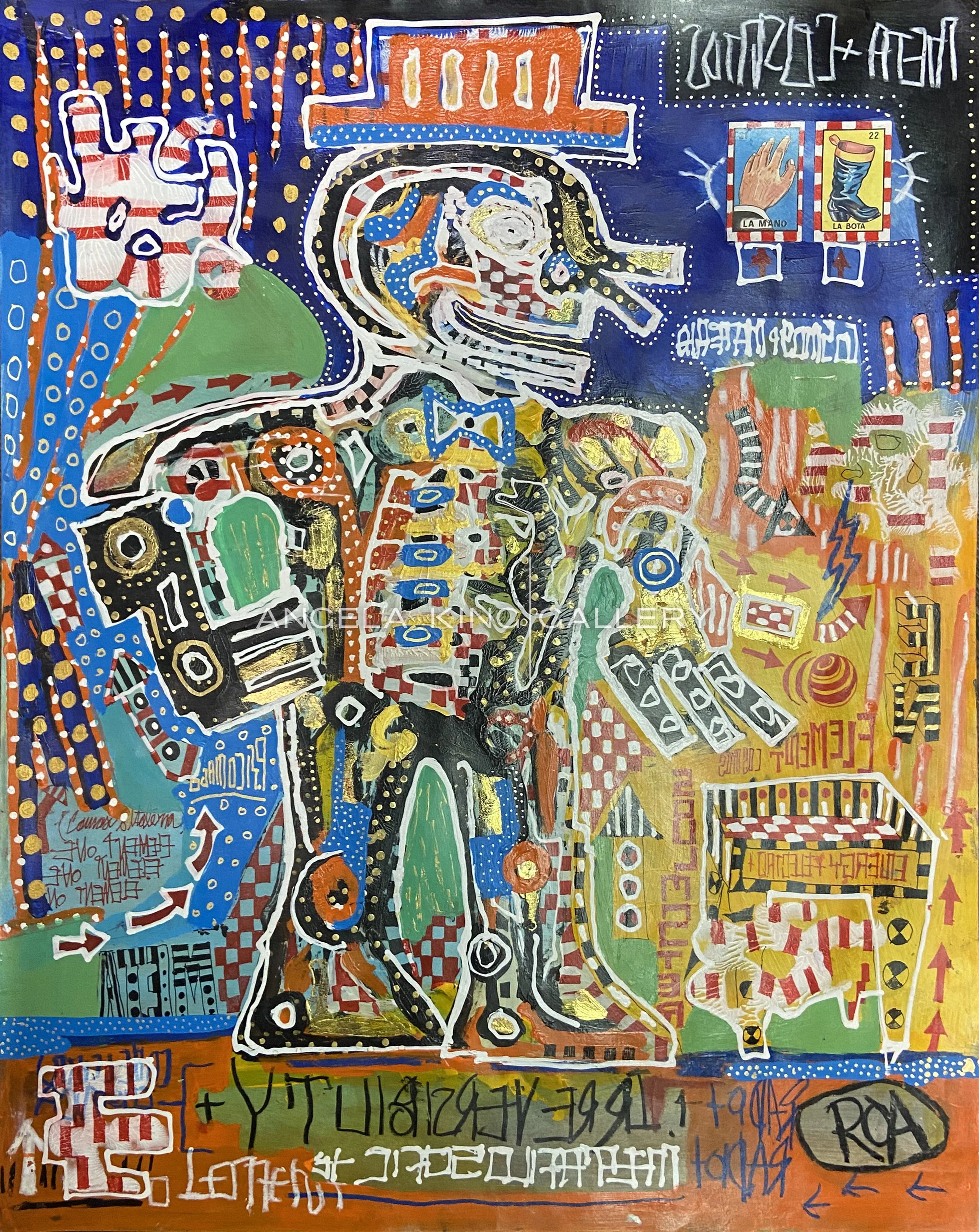 Jacobo Roa is a Mexican artist that combines all of the visceral elements of his life into mixed media pieces that sparkle with bursts of symbolism and color. Roa creates abstract work by way of realism; the emotional thing by means of intellectualism; spontaneity by way of strategy. Roa takes the artifacts from everyday culture and transforms them into extraordinary compositions. The imagery in Roa’s work is a collection of messages, poems, letters; scientific formulas, magic recipes, classifications of ants, medicinal plants and herbs; addresses, numbers, cities, arrows, signs, compasses, names and places that inhabit his world; words in Spanish, Nahuatl, Maya, Latin, or English that have no absolute meaning but rather move and connect within his paintings, to be considered as part of a window to their worlds.