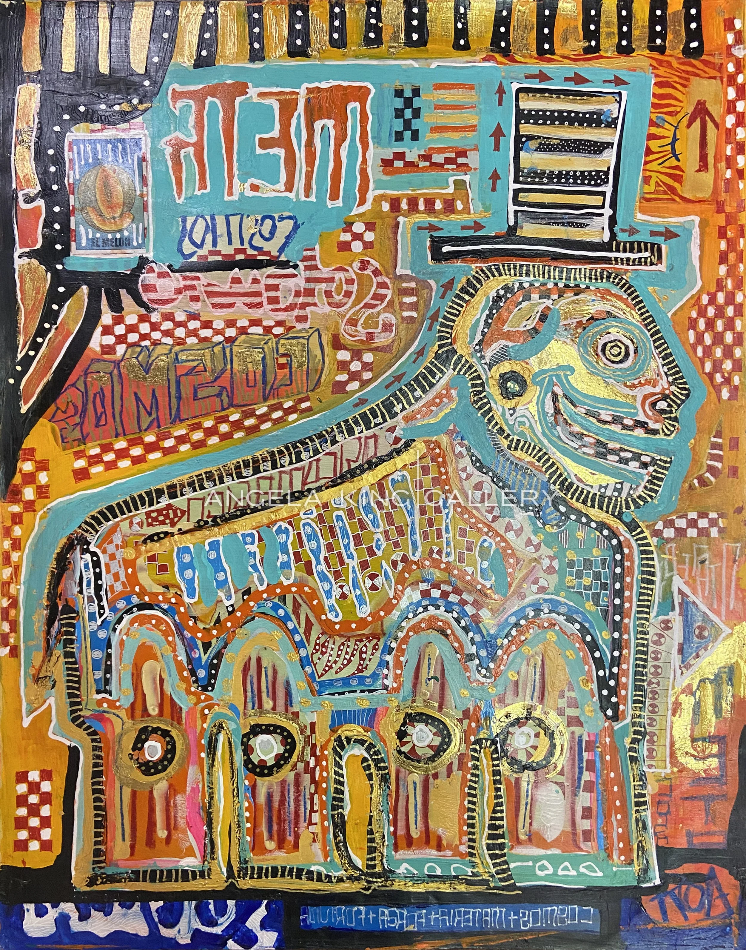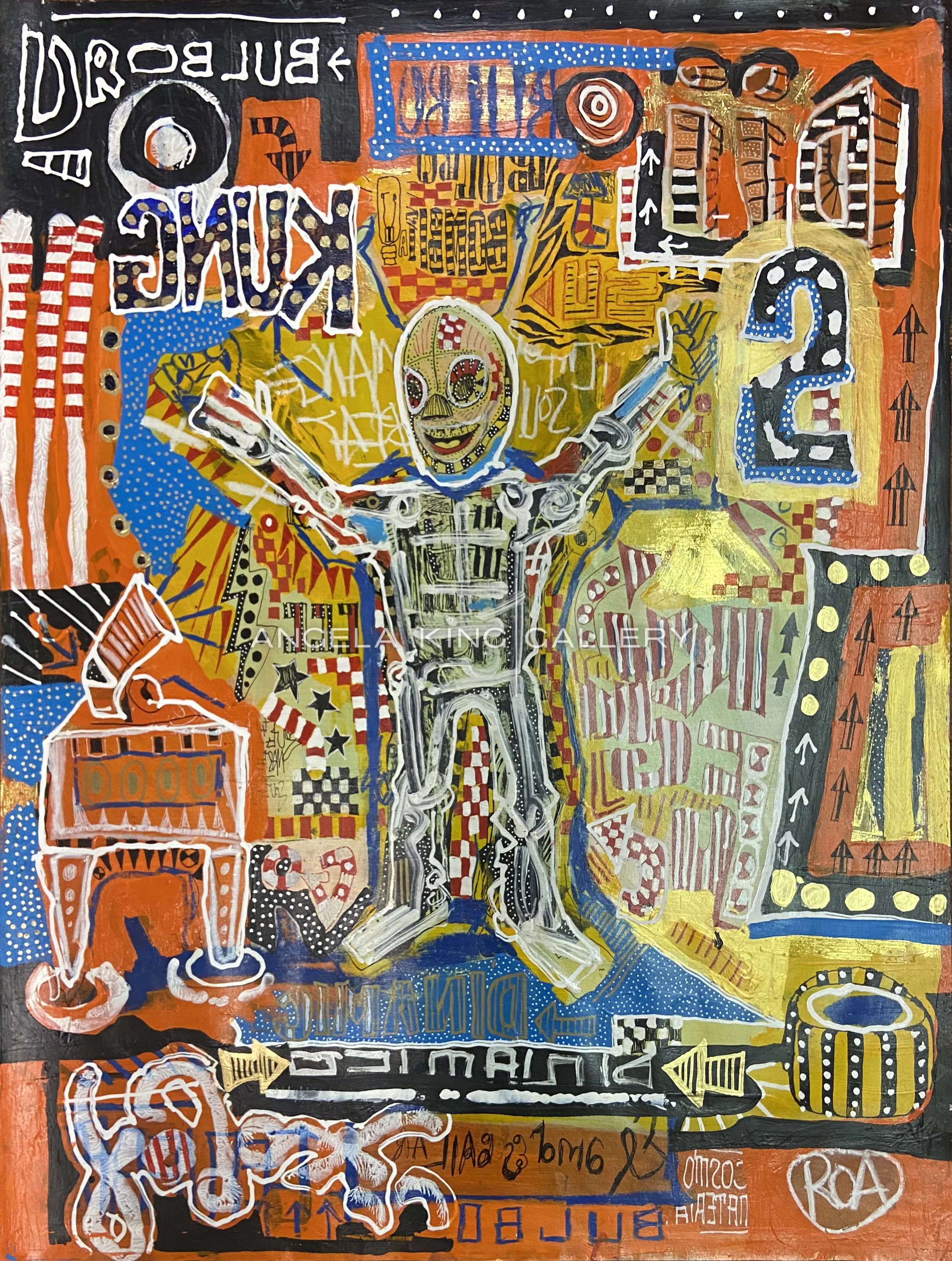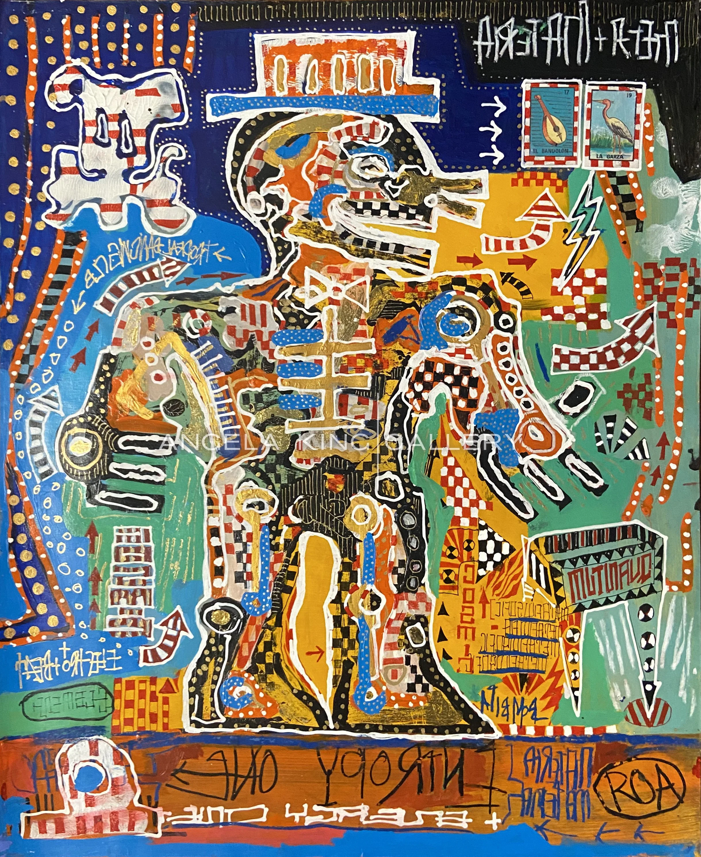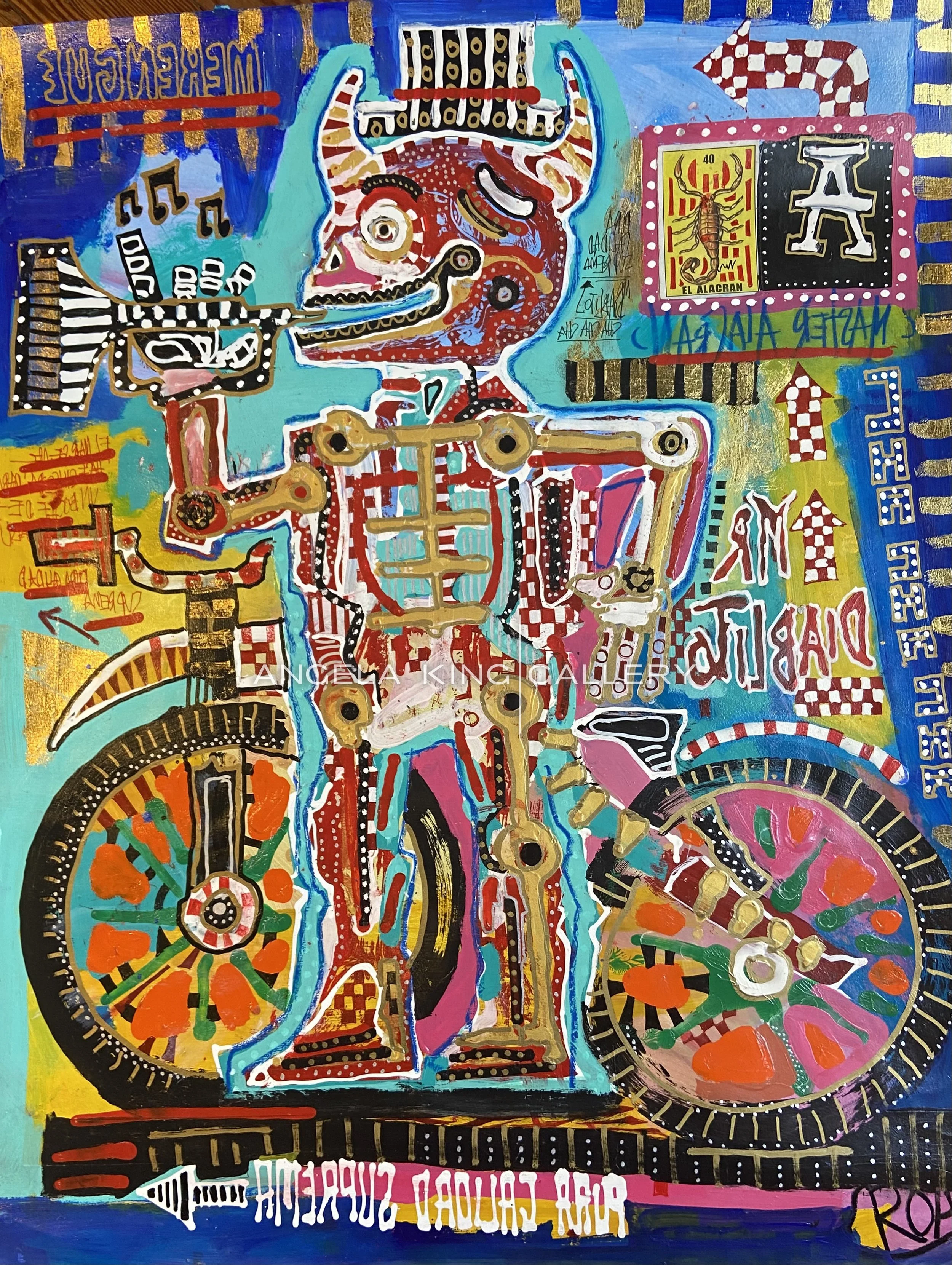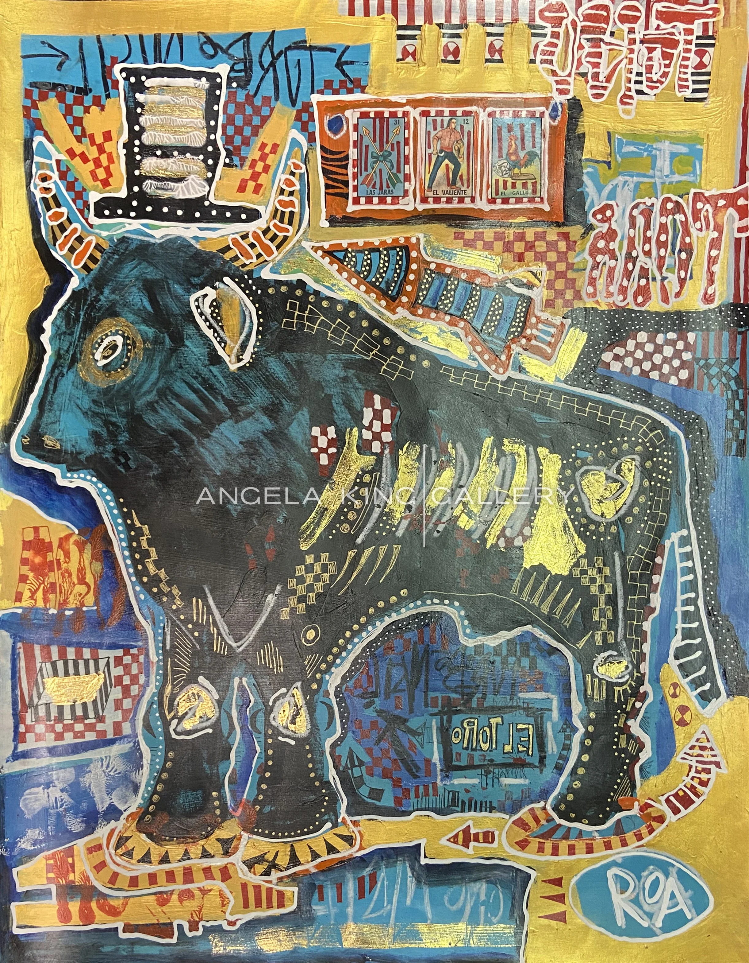 Jacobo Roa is a Mexican artist that combines all of the visceral elements of his life into mixed media pieces that sparkle with bursts of symbolism and color. Roa creates abstract work by way of realism; the emotional thing by means of intellectualism; spontaneity by way of strategy. Roa takes the artifacts from everyday culture and transforms them into extraordinary compositions. The imagery in Roa’s work is a collection of messages, poems, letters; scientific formulas, magic recipes, classifications of ants, medicinal plants and herbs; addresses, numbers, cities, arrows, signs, compasses, names and places that inhabit his world; words in Spanish, Nahuatl, Maya, Latin, or English that have no absolute meaning but rather move and connect within his paintings, to be considered as part of a window to their worlds.