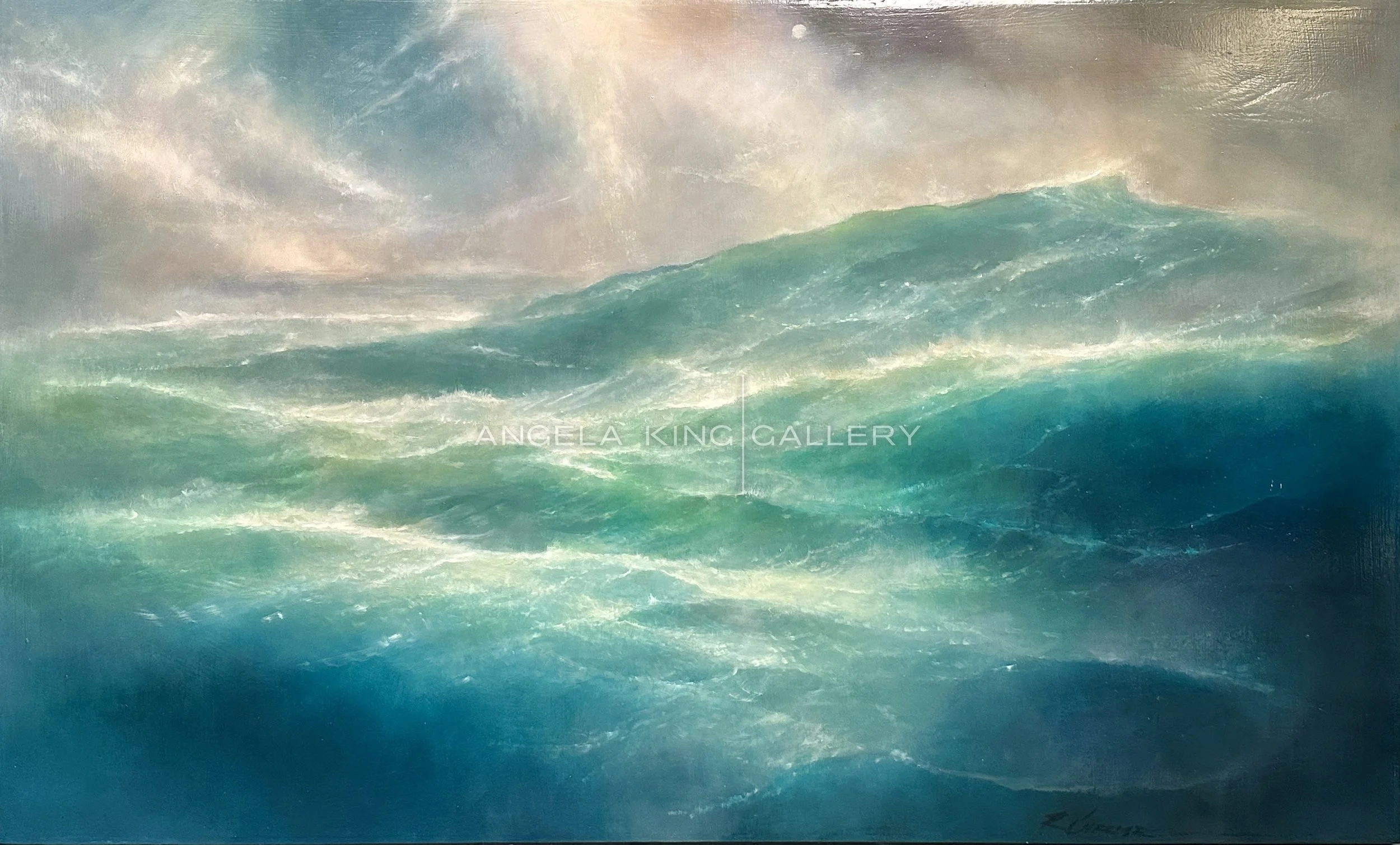 CURRIER'S ATMOSPHERIC OIL PAINTINGS OF OCEANS AND SOUTHERN TROPICAL LANDSCAPES ARE REALISTIC AND ABSTRACT AT THE SAME TIME DEPICTING NATURE IN ART. AS A SAILOR, HE PAINTS FROM THE PERSPECTIVE OF BEING ON THE BOAT, ON CALM AND ROUGH WATER.