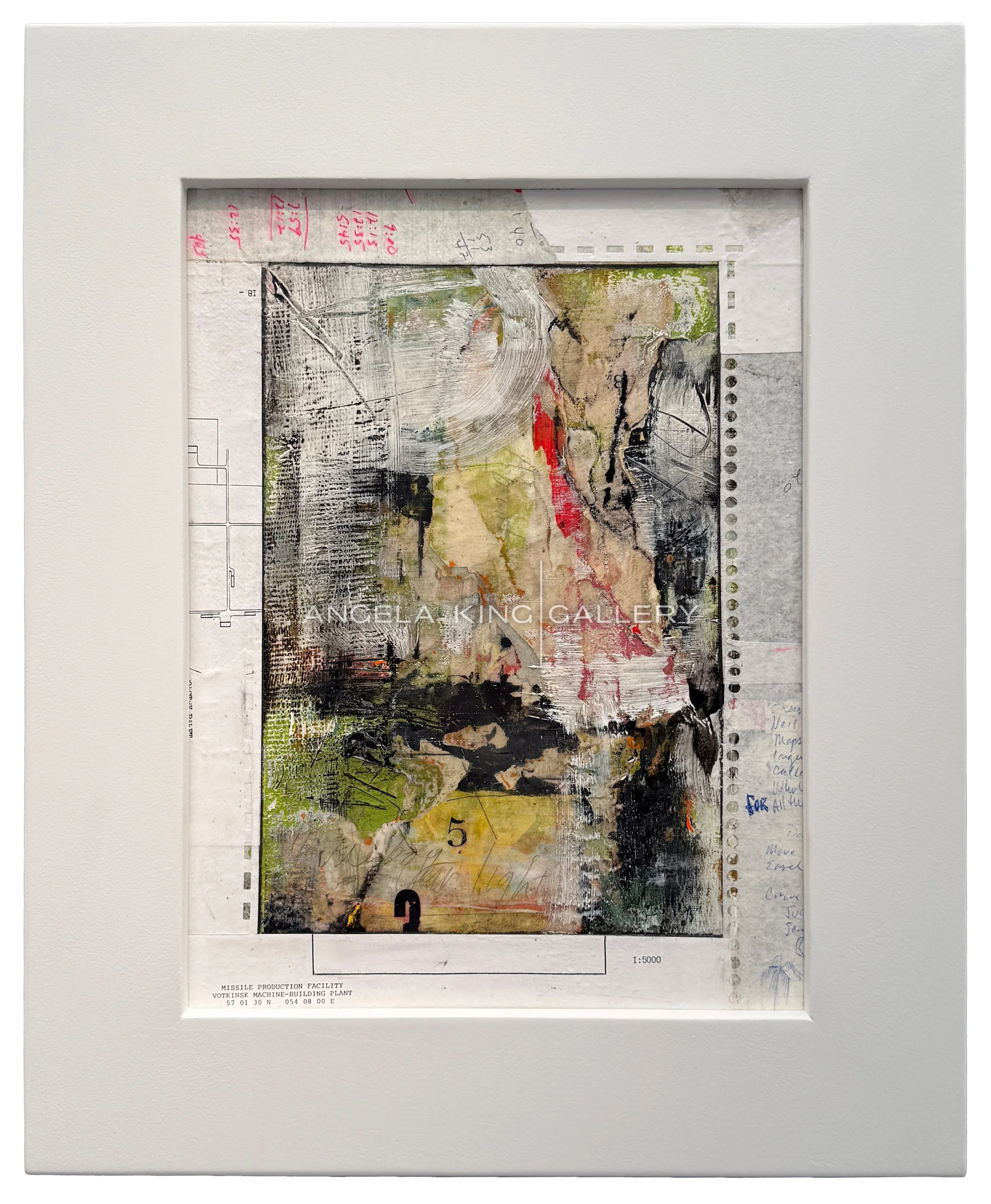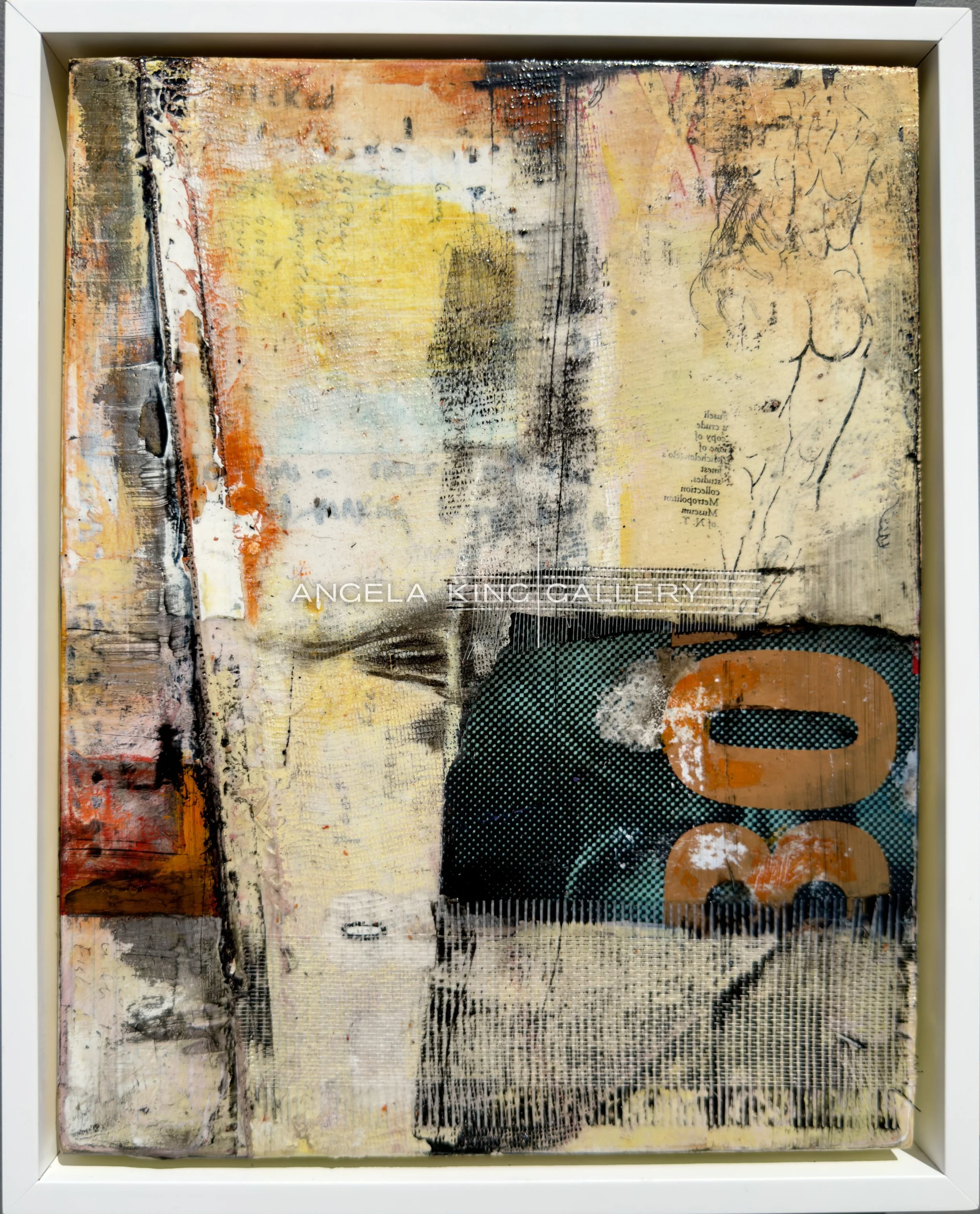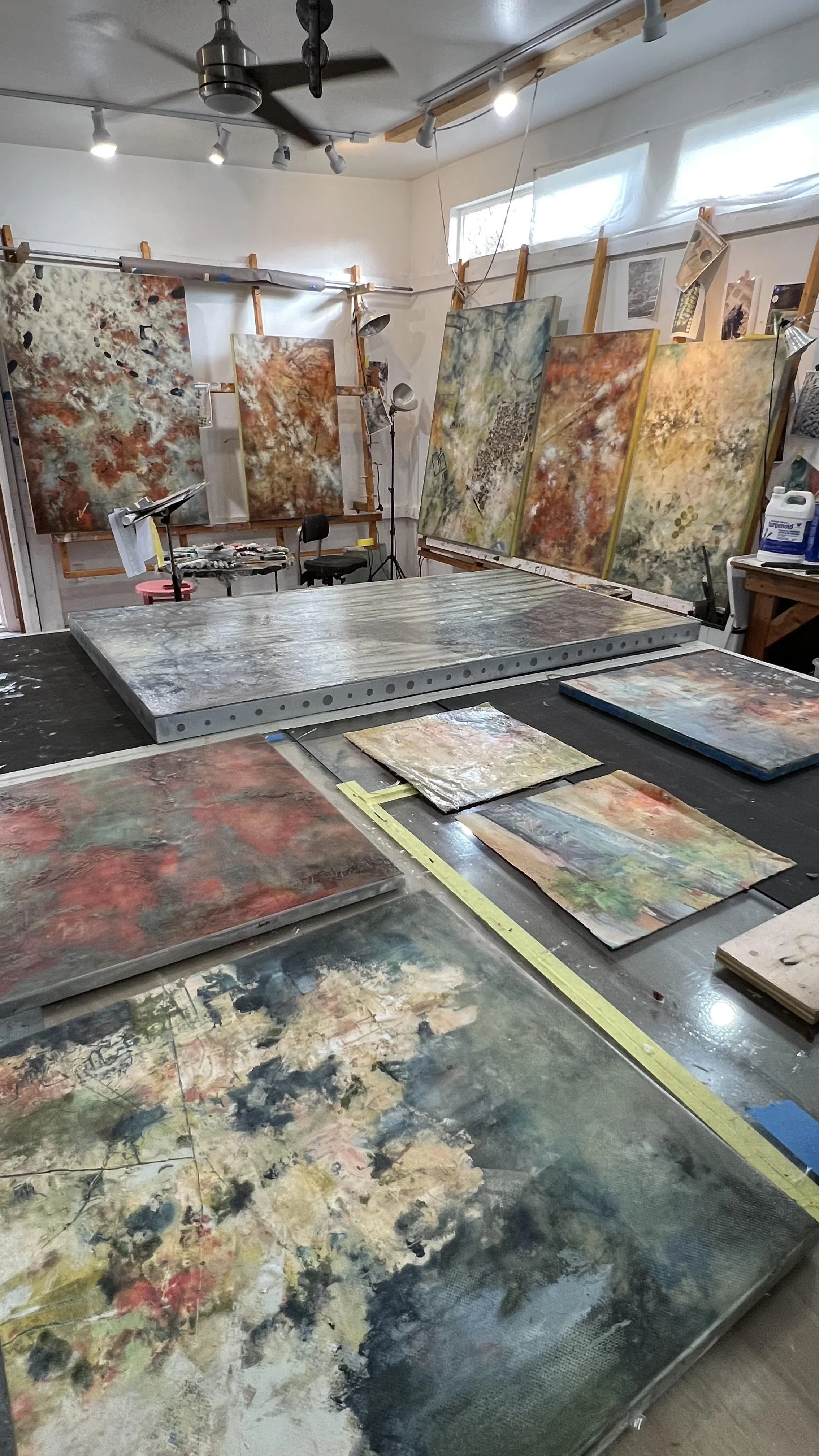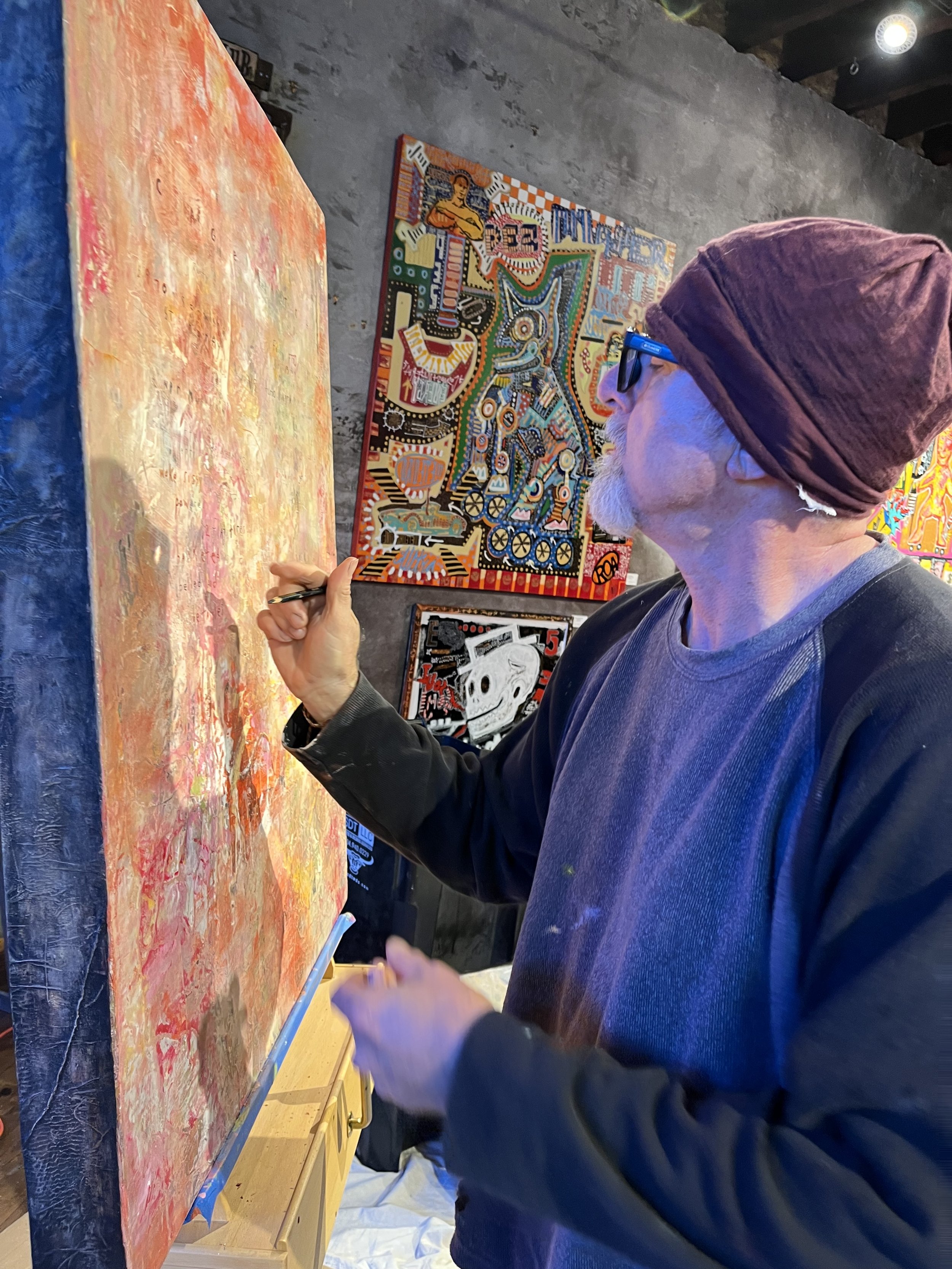 Initially, his work used traditional painting media and constructions. One day, however, he decided to try fiberglass. The result was what he describes as an epiphany. He cleared out his studio and brought in rolls of fiberglass material and drums of resin. The work became intensely hand-made, combining industrial materials with artistic hand work. After spreading a bed of liquid resin, he presses fiberglass fabric into it, working quickly to produce the effects of texture and depth. The level of excitement is high, as the materials begin to solidify. Once hardened, he paints and writes (sometimes backwards) on the surface, then starts another layer of resin and painting. The result has the free-wheeling, visceral effect of a Rauschenberg ‘Combine’.