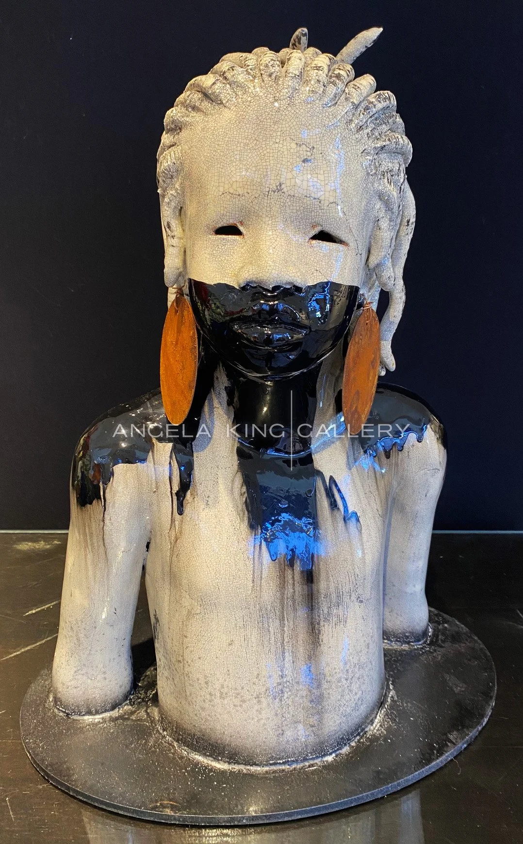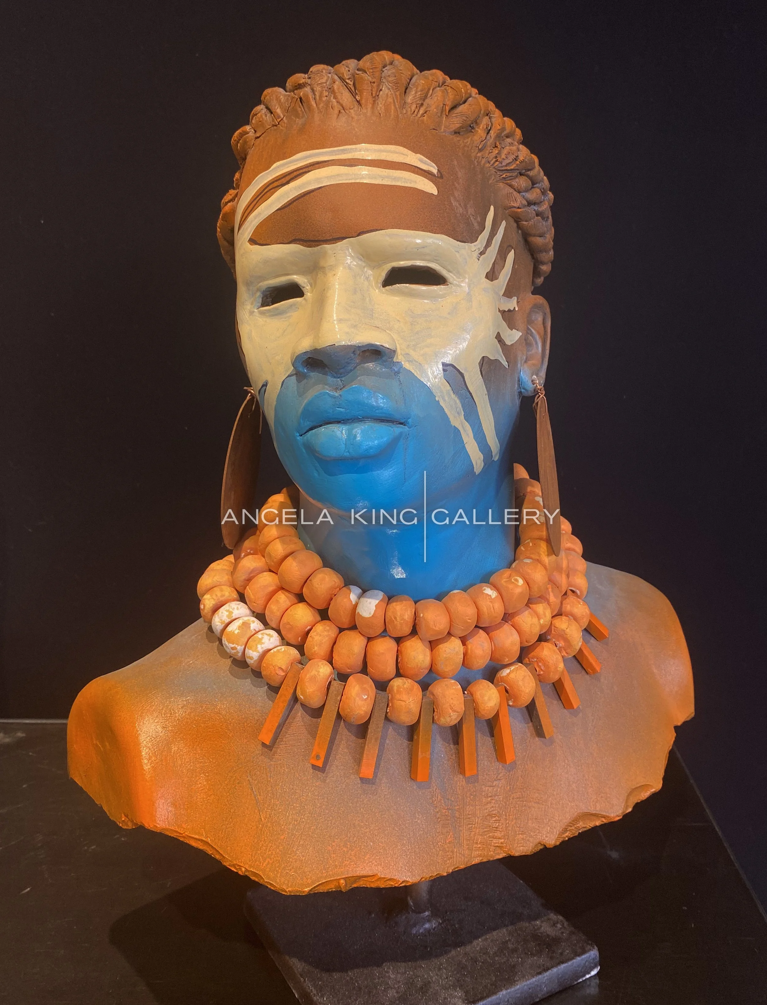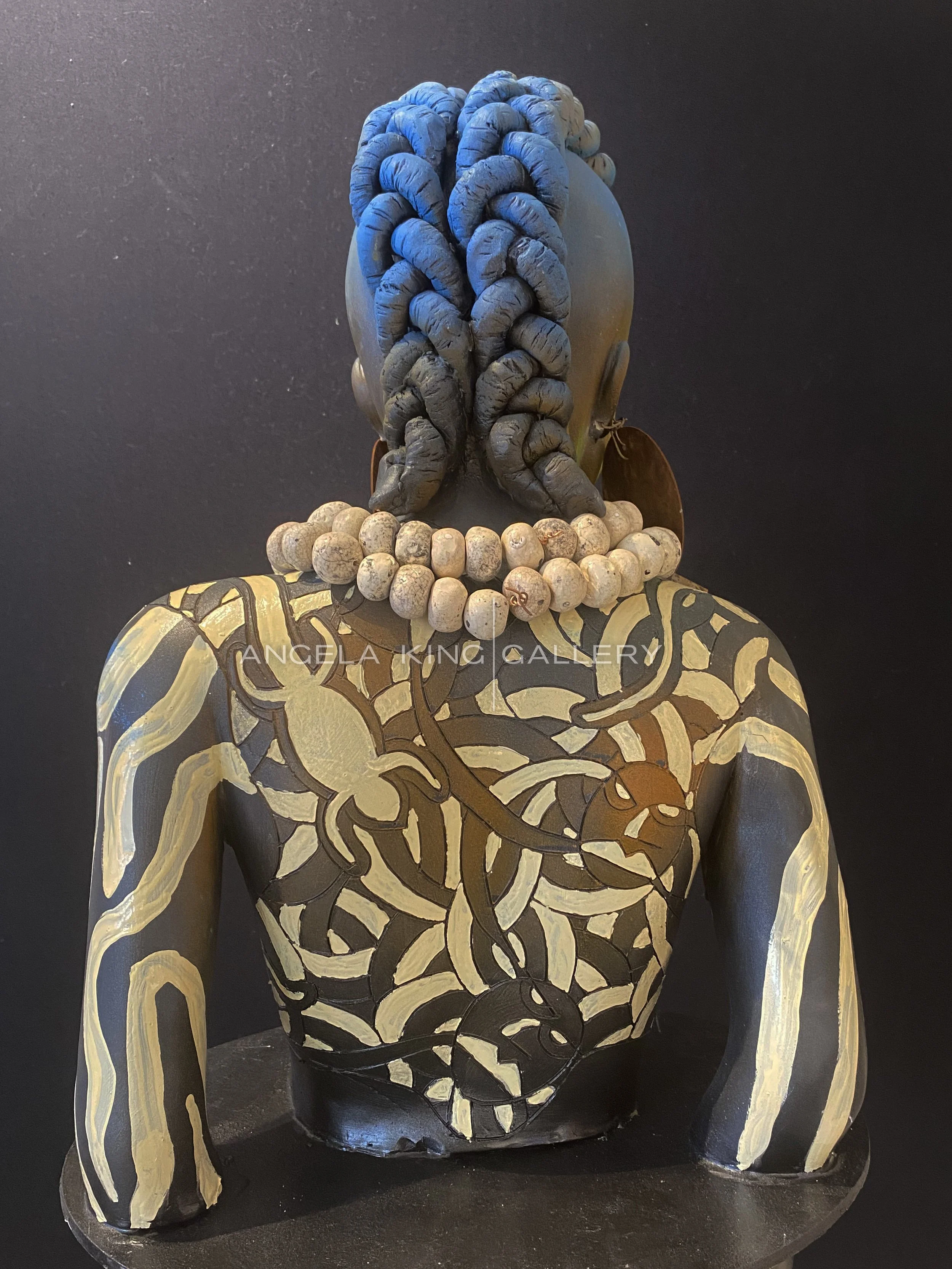 Woodrow Nash's recent sculptural works present the lure and mystery of our past and present reflections. The cut out eyes of his majestic clay figures gaze deep within the historical context of art history as well as carving out new path ways with Nash's sculptural techniques. The range of colors and textures bring Nash's life-like beings down to earth to be observed and reflected upon. His stylized African portraits evoke the 15th century Benin concepts of graceful slender proportions and undulating lines of 18th century Art Nouveau. In his works Nash achieves his goal of integrating expression, complex symbolism and sophisticated aesthetics to yield striking embodiments of the human soul and sensuality.